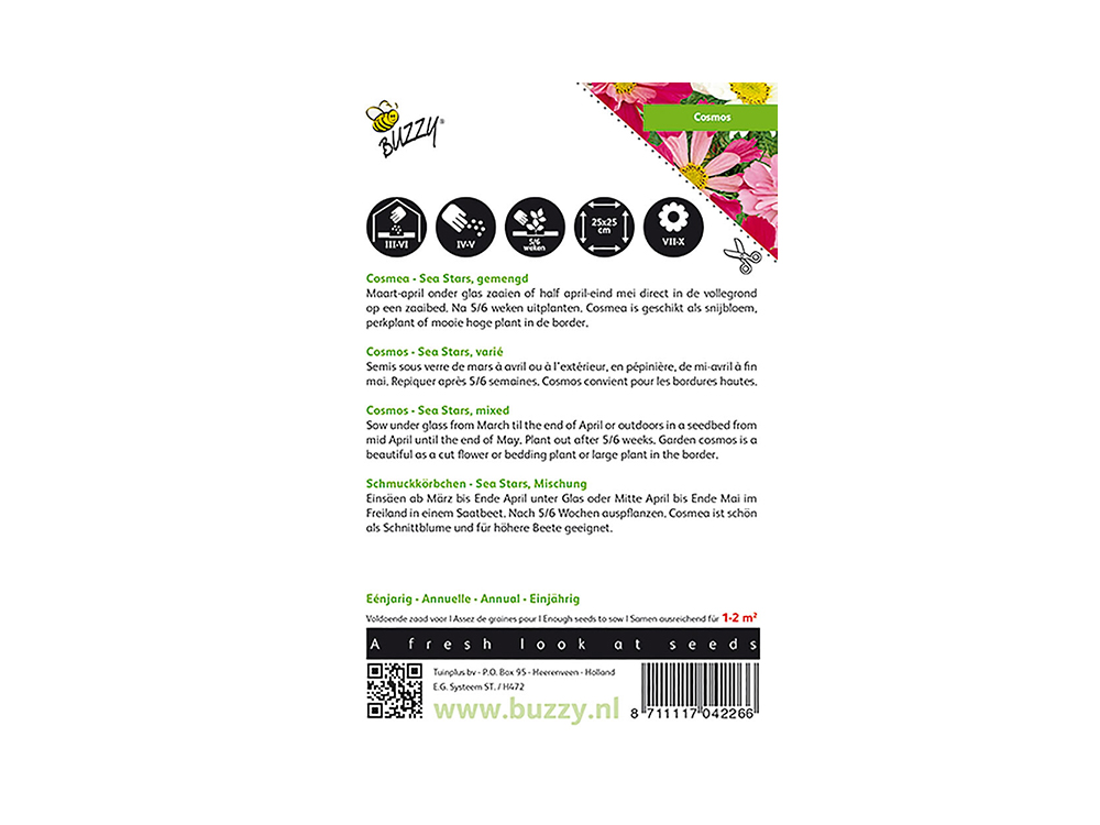 La Cosmea ou Cosmos Sea Stars est une magnifique fleur coupée et plante de massif qui peut être combinée avec de nombreuses autres vivaces. La plante annuelle atteint une hauteur d’environ 80 cm. Les fleurs s’épanouissent abondamment et longtemps, et constituent également d’excellentes sources de nectar pour les insectes. Les étoiles de mer mélangées sont un mélange de fleurs blanches et roses dans différentes nuances.
