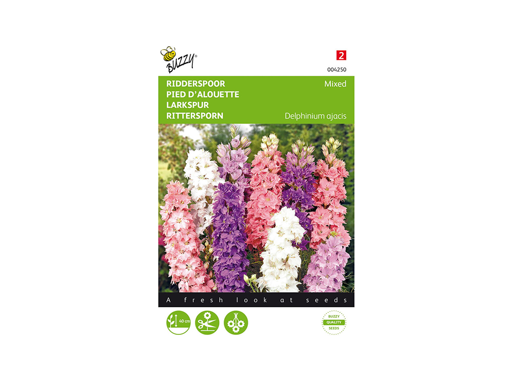 Éperon mélangé, une espèce de fleur de jacinthe, qui ne mesure que 40 cm de hauteur. Ce paquet contient un mélange de graines à partir duquel poussent des plantes à fleurs bleues, lilas-roses et blanches. Magnifique entre plantes basses dans les bordures et les plates-bandes, mais aussi excellente comme fleur coupée !