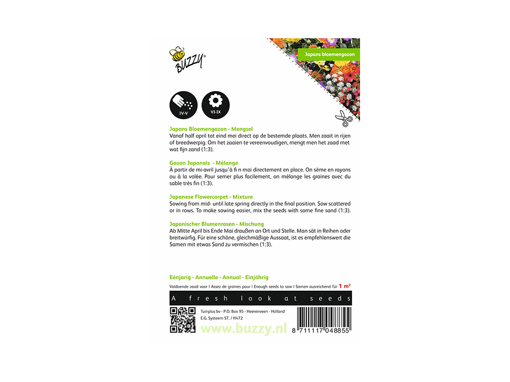 Ce paquet contient des graines issues d’un riche mélange annuel de pelouse de fleurs japonaises. Comme les plantes restent basses et présentent une teinte riche, on appelle cela la pelouse fleurie. Elle contient des plantes annuelles et vivaces. L’effet est fantastique ! Et pas seulement cette année mais aussi l’année prochaine, car les plantes s’auto-sement ou germent à nouveau. Laissez certaines fleurs s’épanouir complètement afin qu’elles puissent former des graines discrètement.