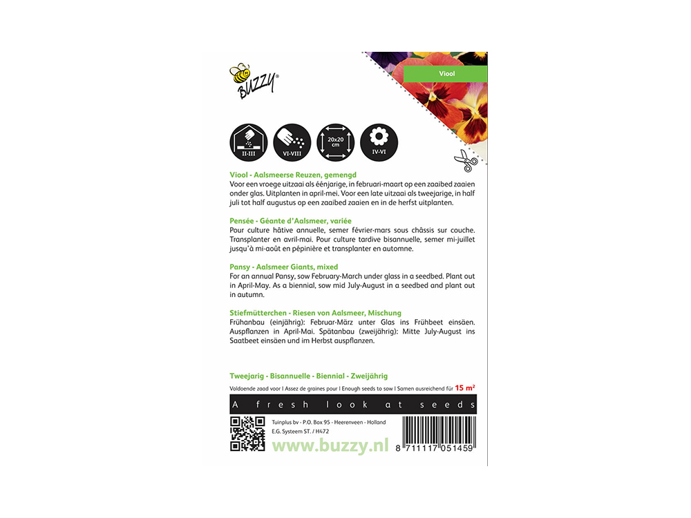 Ce mélange de pensées à grandes fleurs du groupe des « géants hollandais » peut être cultivé aussi bien annuellement qu’aux deux ans. Viola Aalsmeerse Reuzen est parfaite pour la plantation en bordure, les plates-bandes, les bordures et les pots de fleurs.