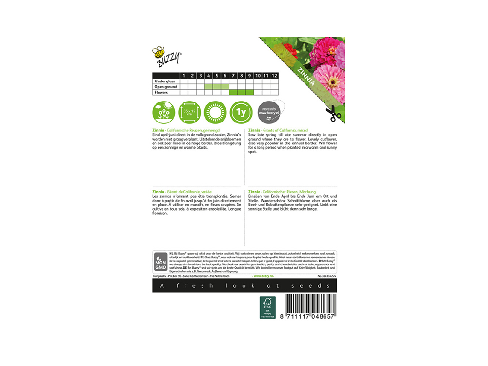 Le mélange de géants de Californie Zinnia est un mélange annuel de graines avec d’énormes fleurs doubles aux couleurs magnifiques. Les fleurs atteignent 10 à 12 cm de diamètre et les tiges mesurent 80 cm de long. Adapté comme fleur coupée, mais aussi adapté aux bordures et plates-bandes.