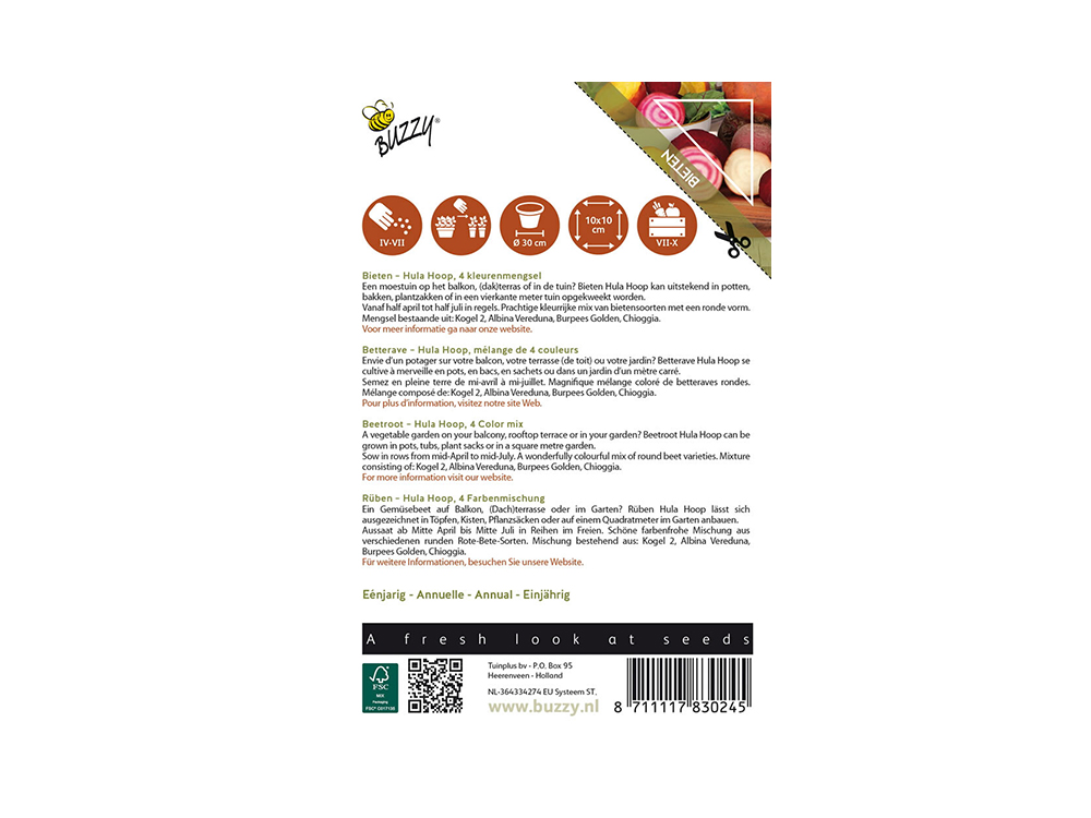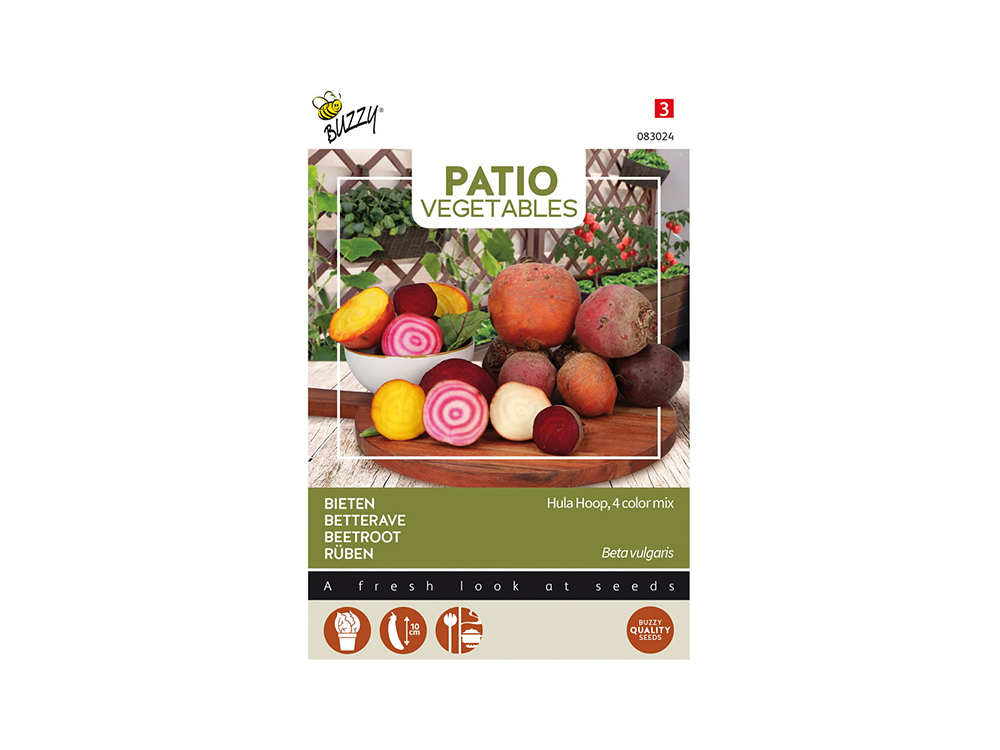 Beet Hula Hoop est un magnifique mélange de quatre betteraves rondes différentes : Albina Verduna (blanc), Burpees Golden (jaune), Kogel 2 (rouge) et Chioggia (rouge-blanc). Cette variété colorée rend n’importe quel plat attrayant et les betteraves conviennent aussi aux mini-betteraves.