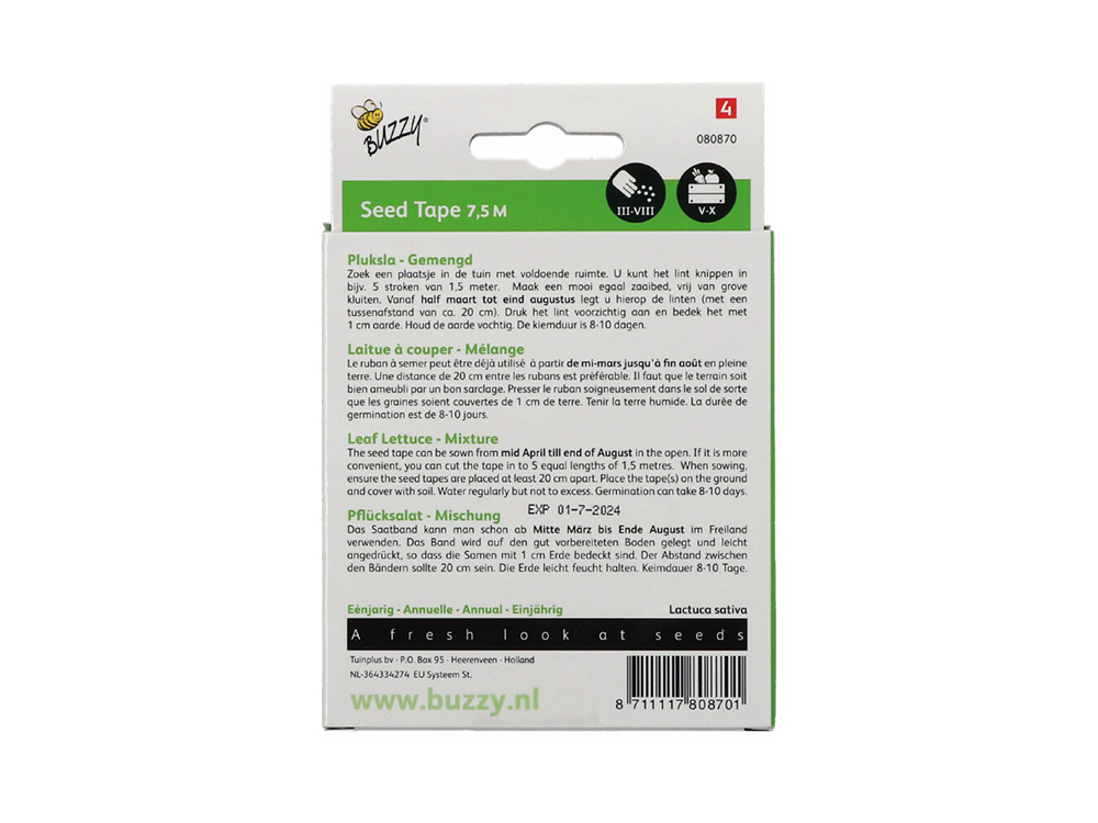 Trouvez un endroit dans le jardin avec assez d’espace. Vous pouvez aussi découper le ruban, par exemple, en 5 bandes de 1,5 mètre. Faites un lit de semences bien uniforme, sans mottes grossières. De la mi-mars au début août, posez les rubans sur le dessus sur une distance d’environ 20 cm. Pressez doucement le ruban et couvrez de 1 cm de terre. Gardez le sol humide. Le temps de germination est d’environ 8 à 10 jours.
