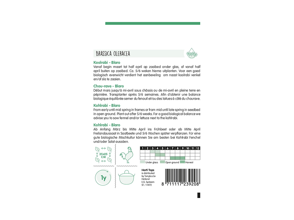 Semez le chou-rave Blaro sous verre du début mars à la mi-avril. Dehors depuis la mi-avril. Plantez après 5 à 6 semaines. Distance entre plantes : 25 cm. Semez du fenouil et/ou de la laitue à côté du chou-rave pour un bon équilibre biologique.