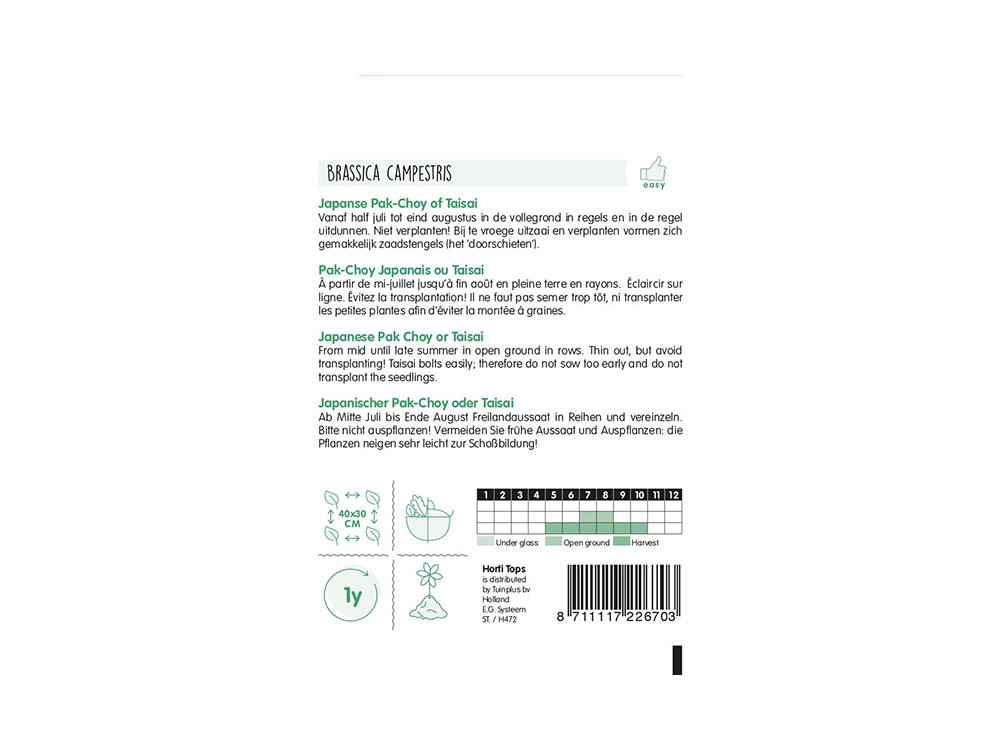 Semez le Pak-Choy japonais ou Taisai en rangées de la mi-juillet à la fin août en terrain ouvert et éclaircez généralement. Ne pas transplanter ! Si le semis et la transplantation sont trop tôt, les tiges de graines se forment facilement (boulonnage).