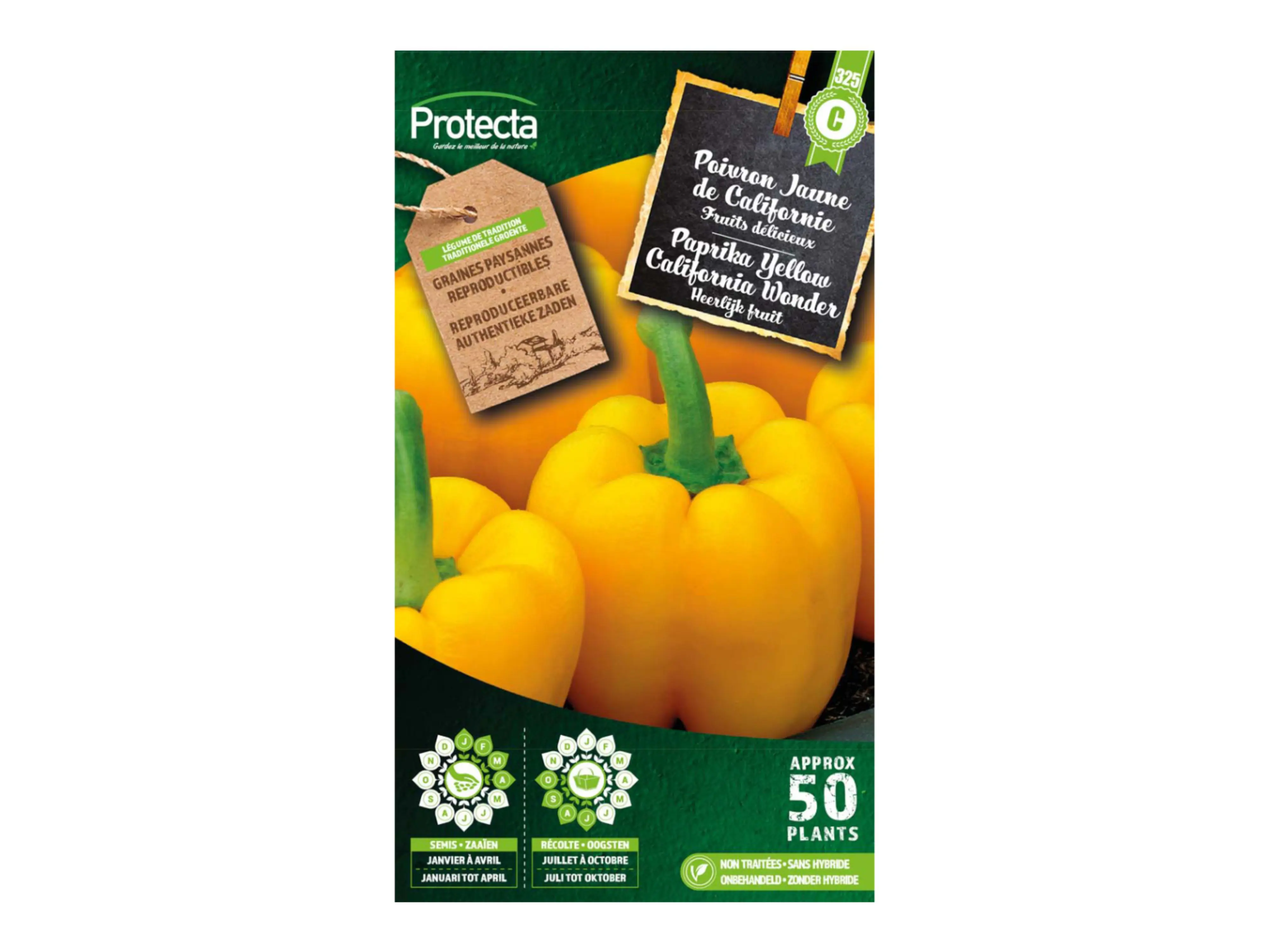 Paprika Yellow California Wonder, un paprika délicieux et sucré avec une belle couleur jaune-orangée une fois mûre. Les fruits fermes et carrés ont 3 à 4 coquilles de graines et une chair épaisse. Solide, productif et idéal pour le jardin ou la véranda.