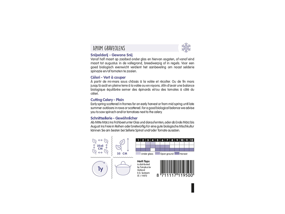 Coupe du céleri La coupe courante est une variété bien connue pour la coupe du céleri. Semez des épinards et/ou des tomates en plus du céleri pour un bon équilibre biologique. Le céleri peut être consommé cru ou cuit. Un assaisonnement délicieux dans la soupe.