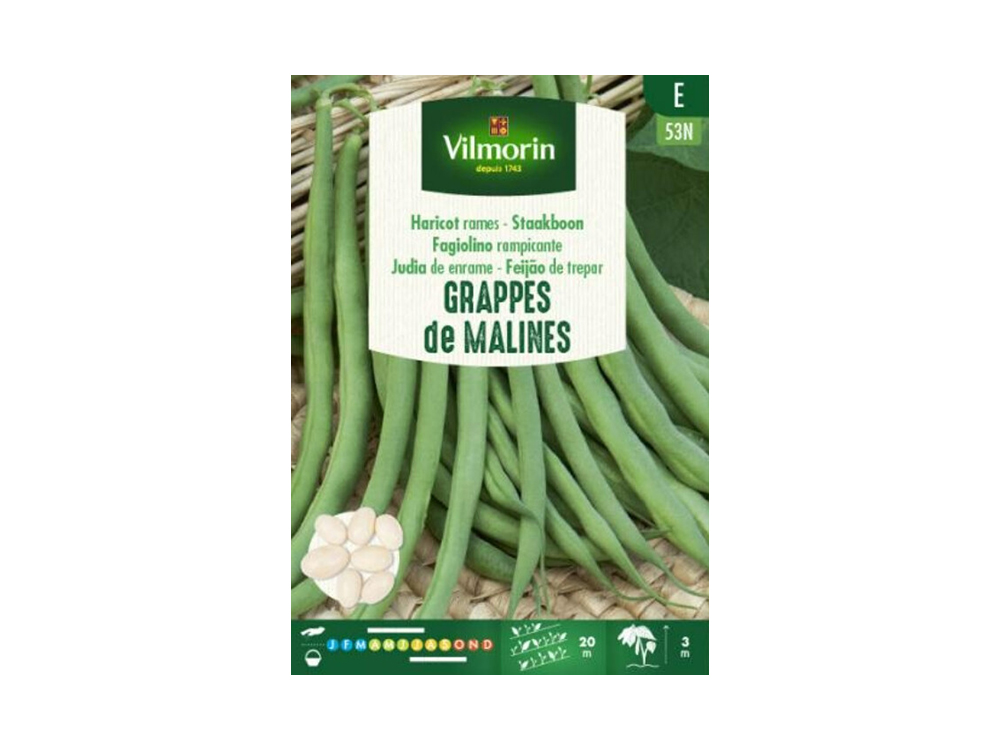 Les Grappes de Malines de Vilmorin forment des gousses fines scellées en blanc. Cette première variété a une production élevée. Les plantes atteignent environ 3 mètres de hauteur.