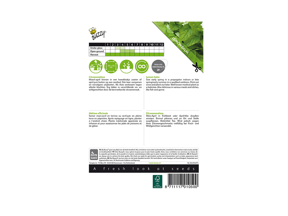 La mélisse est une plante herbacée vivace qui vit sous terre en hiver via des rhizomes. La plante, qui atteint une hauteur de 50 à 80 cm, possède des fleurs blanches et un doux parfum citronné, moins fort que l’herbe citronnée, avec lequel elle est parfois confondue. Cette herbe est souvent utilisée dans le thé à la mélisse citronnière et ajoute une saveur fraîche de citron aux plats de poisson et de gibier.