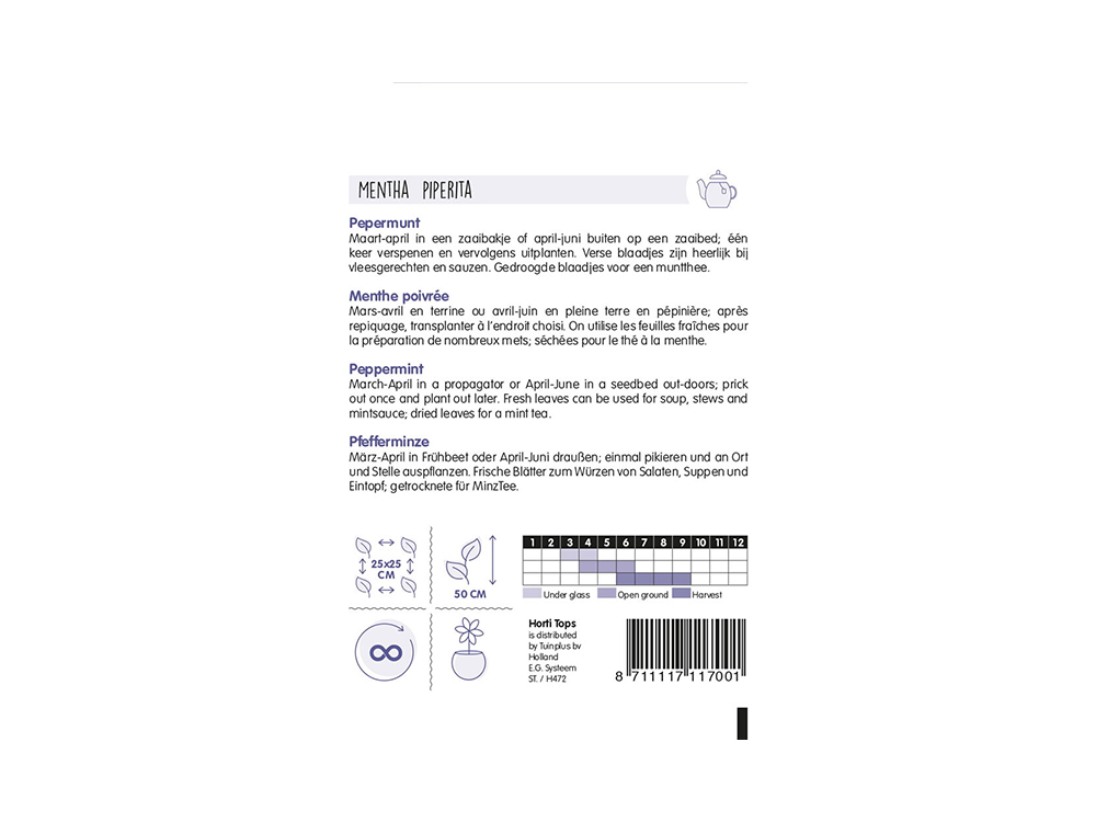 La menthe poivrée est une herbe savoureuse pour un délicieux thé à la menthe fraîche. Les feuilles peuvent être utilisées à la fois séchées et fraîches dans le thé. Frais également, délicieux, avec des plats de poisson et diverses sauces. Vivace vivace avec des fleurs violettes qui attirent de nombreux insectes.