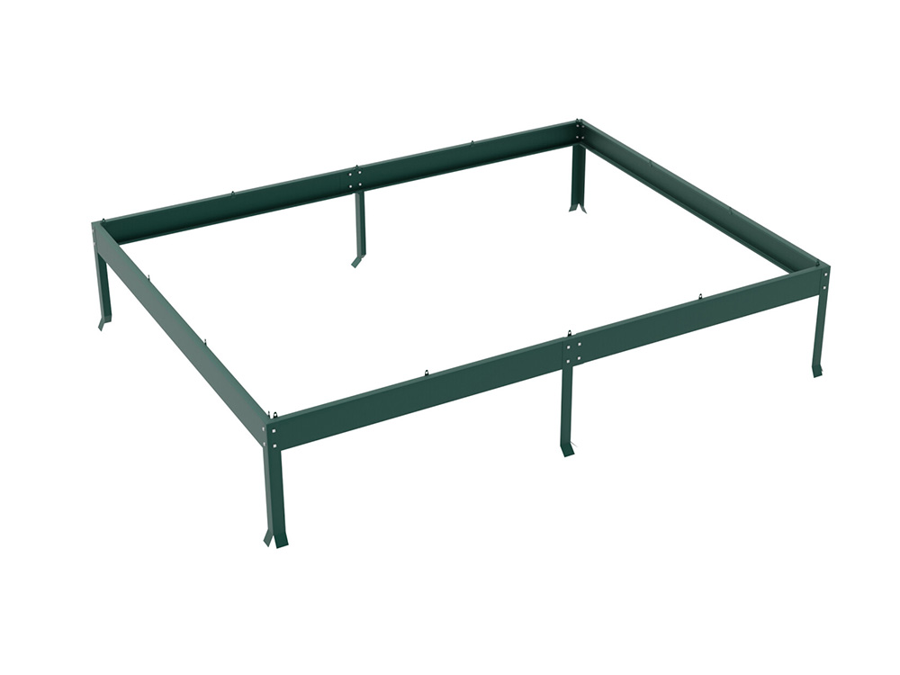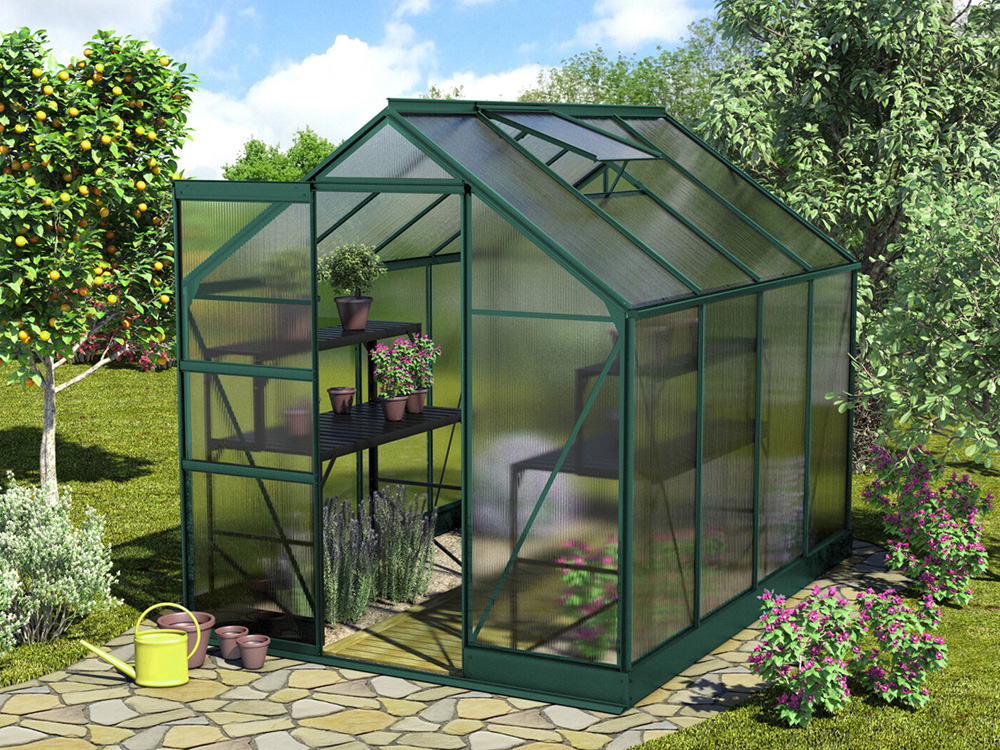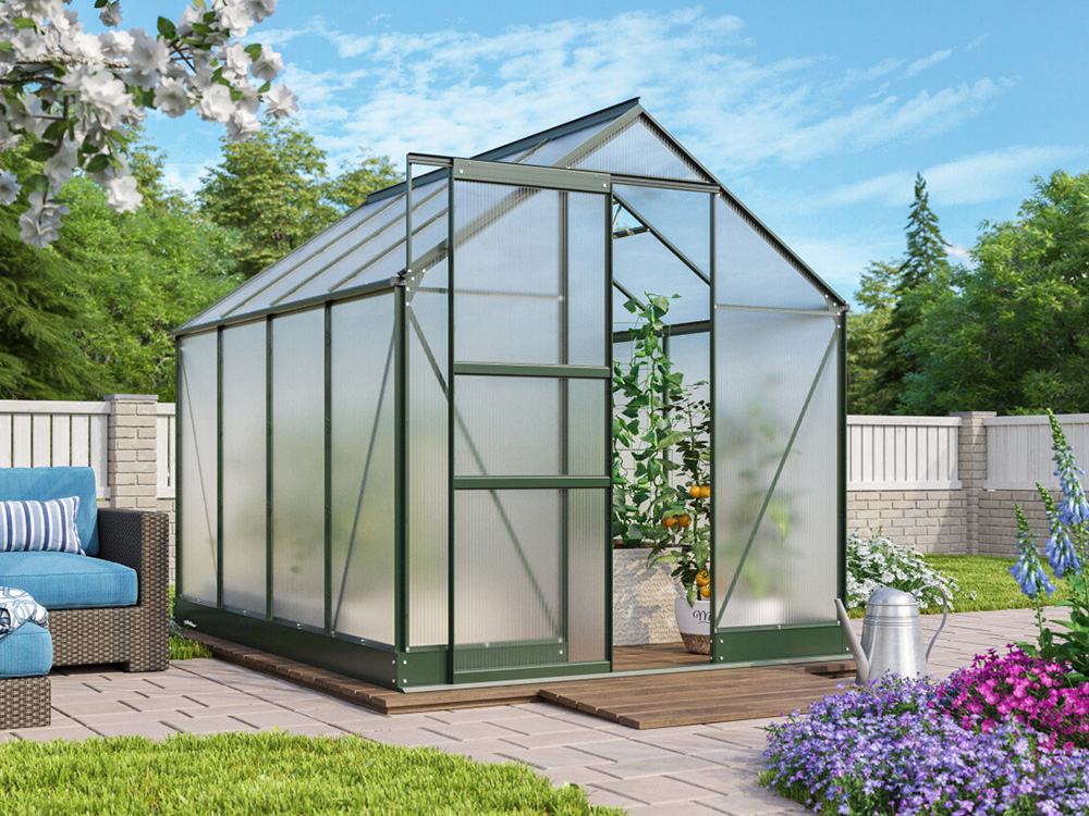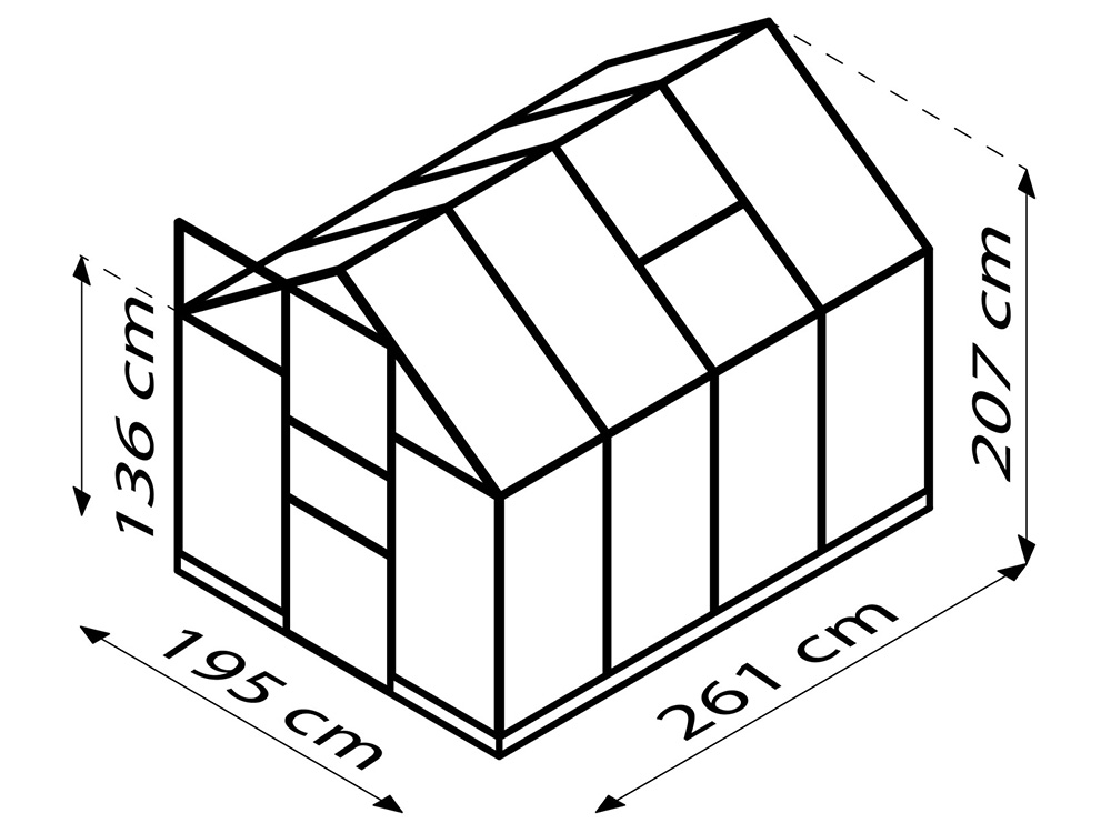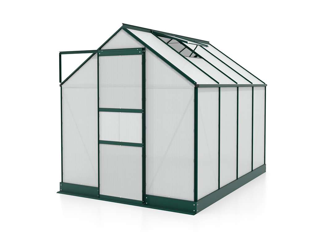 Le cadre est composé de profils en aluminium verd revêtu en poudre. La porte coulissante de 61 cm de large peut être suspendue de manière à s’ouvrir à gauche ou à droite. La serre est également équipée de gouttières intégrées et de fondations dans la structure de la serre. La fondation assure une connexion solide et optimale entre le cadre et la fondation.