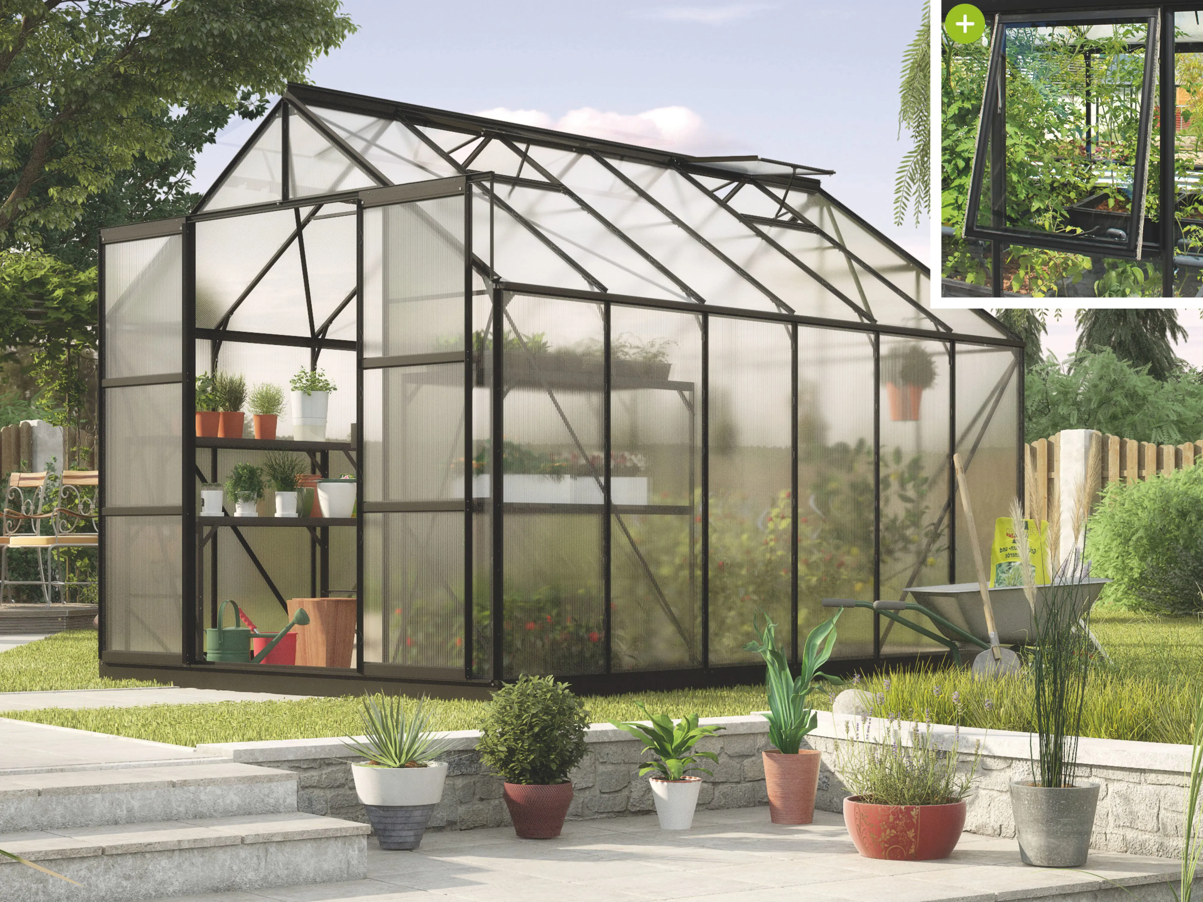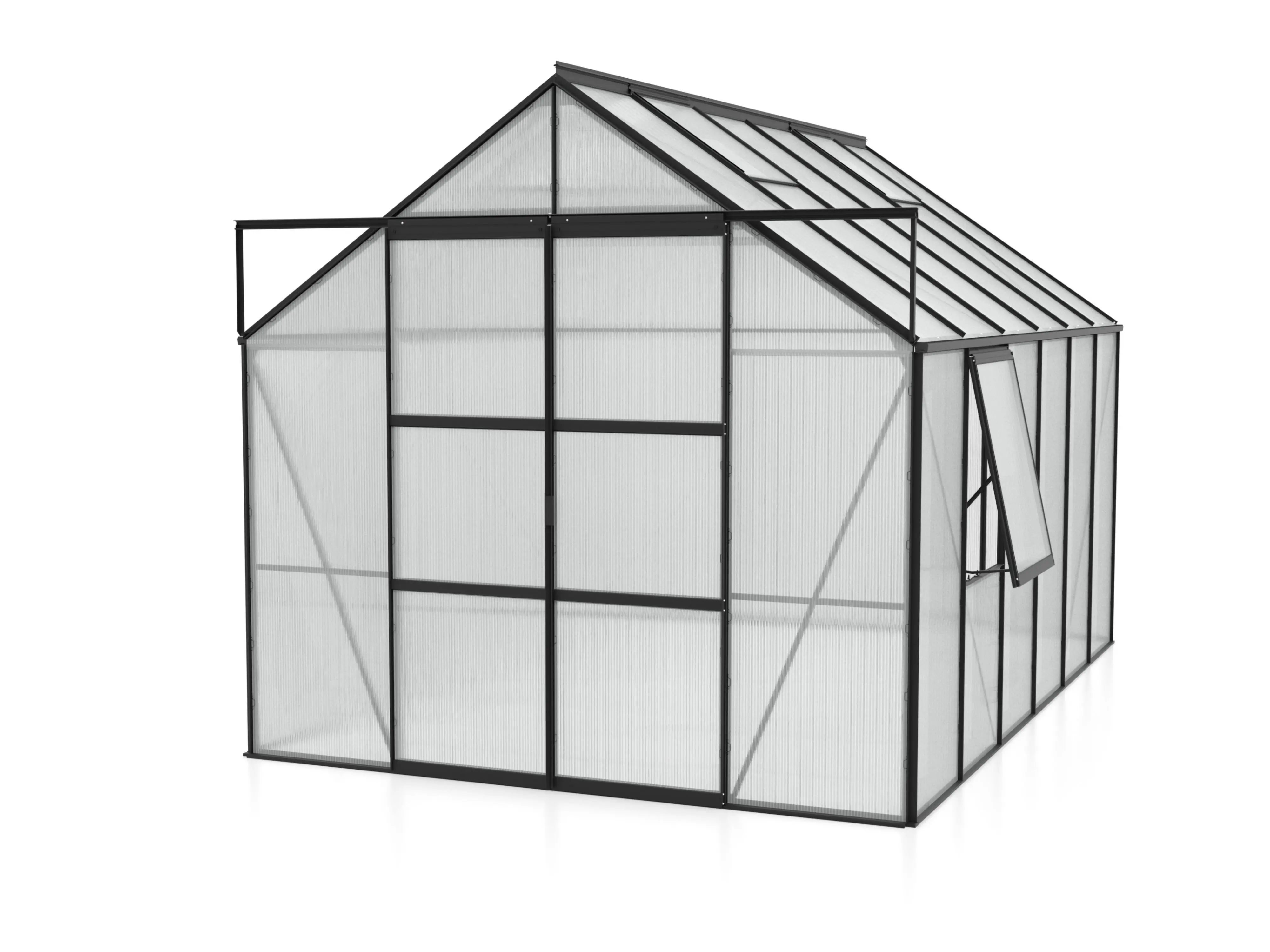 Jupiter a une hauteur impressionnante de 248 cm et une largeur de 257 cm. Une hauteur de bord de toit de 154 cm offre plus d’espace pour la tête et d’espace de travail. Une résistance supplémentaire est obtenue grâce à des plaques d’angle et des renforts dans toute la serre, afin que vous puissiez exercer plus de tension sans souci.