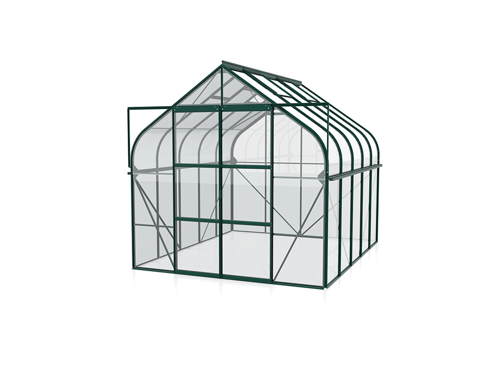 La serre est fabriquée en aluminium vert résistant et recouvert de poudre et équipée de verre de sécurité de 3 mm de série pour une construction robuste et un maximum de lumière. Les bords courbés sont recouverts de feuilles de polycarbonate transparent résistantes aux UV. D’autres détails pratiques sont les gouttières intégrées et 1 à 4 puits de lumière (selon la taille) pour une ventilation optimale.