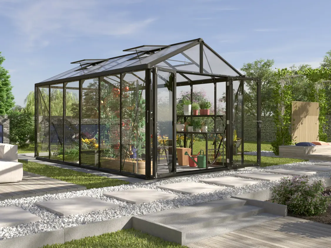 Pour une protection et une isolation optimales, la serre est équipée de verre de sécurité de 3 mm d’épaisseur sur les côtés et de plaques de polycarbonate double paroi de 10 mm sur le toit, réduisant ainsi la condensation et les pertes de chaleur. Le cadre robuste en aluminium noir recouvert de poudre offre non seulement une construction robuste mais aussi un aspect luxueux.