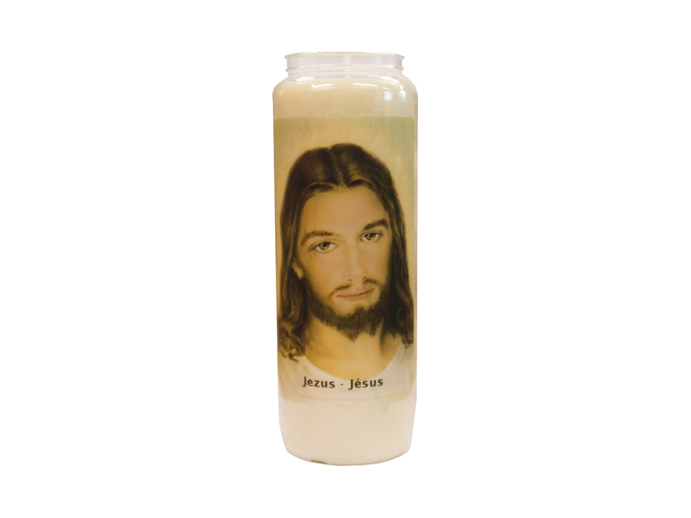 La bougie possède un support en plastique transparent avec une image de Jésus et l’inscription « Jésus - Jésus ».