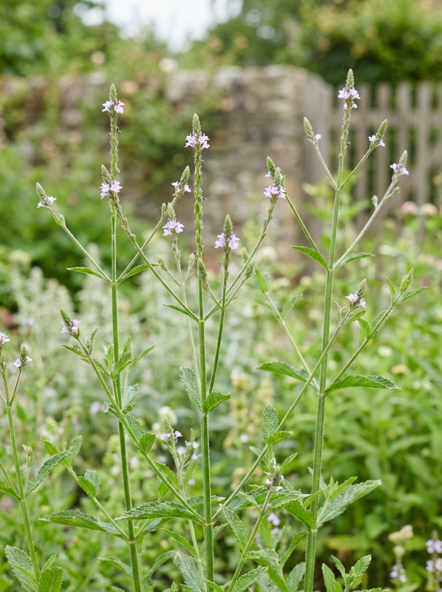 Verbena officinalis a un habit rond, fleurissant abondamment sur de longues tiges raides mal ramifiées avec de longues épines violacées et vives.