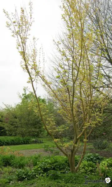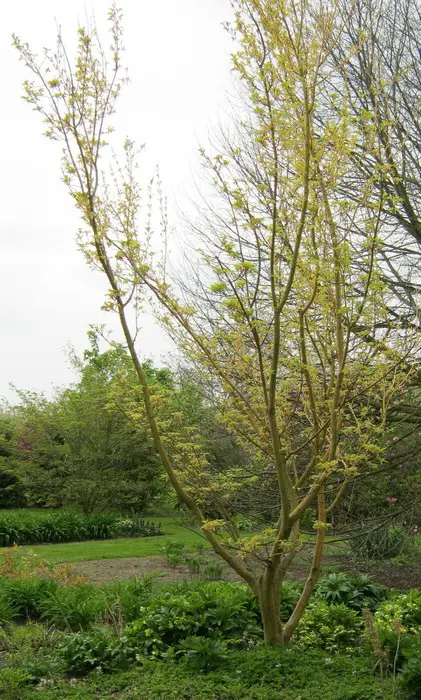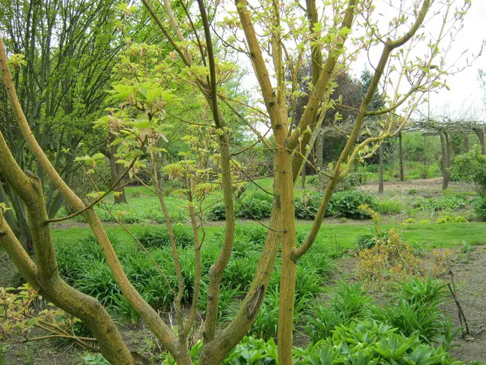 Acer rufinerve 'Erythrocladum' est une variété avec un tronc blanc rayé de jaune qui ressort particulièrement bien en hiver.