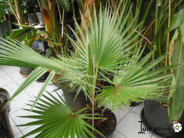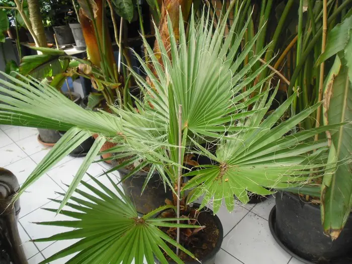La Washingtonia filifera possède de grandes feuilles en forme d’éventail.Peut tolérer jusqu’à -8°C dans un endroit abrité, un sol pas trop humide en hiver et bien enveloppé.Couvrez le sol d’une épaisse couche de paillis d’écorce.