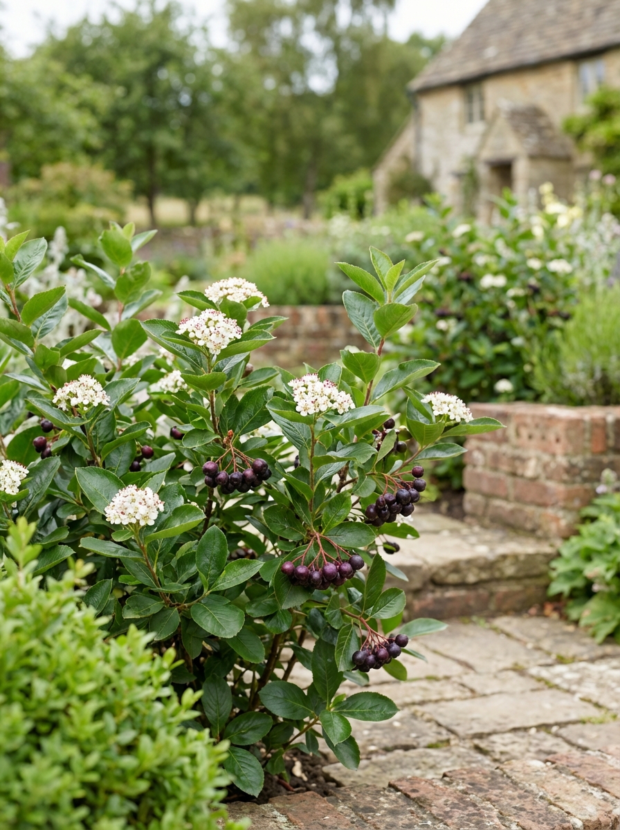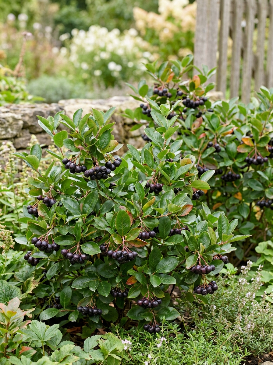 Aronia melanocarpa 'Professor Ed' est une forme compacte avec de grosses grappes de cassis noirs de 1 mm Ø qui peuvent être utilisées dans la confiture et la confiture.