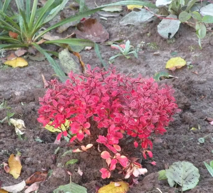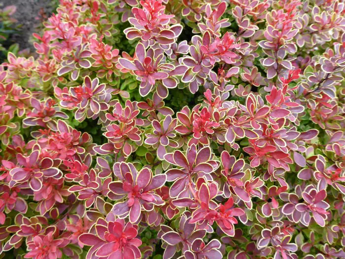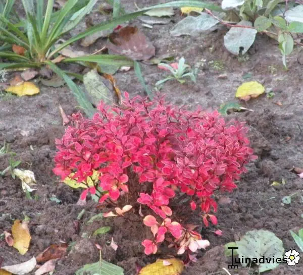 Berberis thunbergii 'Admiration' est un magnifique arbuste nain épineux et compact, avec de petites feuilles rondes et brillantes. Pousser en rouge corail puis devenir violet avec des bords jaunes. À l’automne, elles prennent alors une couleur orange-rouge.