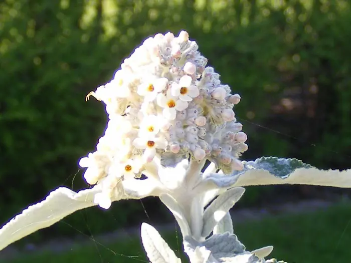 Buddleja « Silver Anniversary » est un buisson de papillons aux feuilles argentées lancéolées, duveteuses et éclatantes, fleurissant avec des fleurs blanches parfumées et un œil jaune.