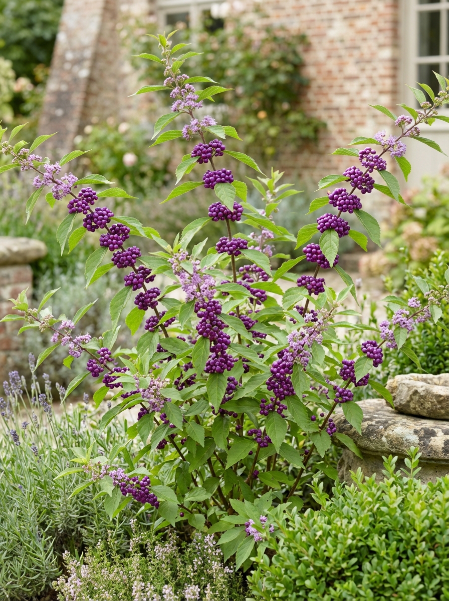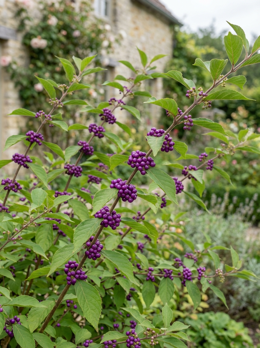 Callicarpa bodinieri est un arbuste droit aux feuilles vert terne, mais il est surtout connu pour ses magnifiques baies violettes qui apparaissent abondamment sur l’arbuste à partir de septembre.