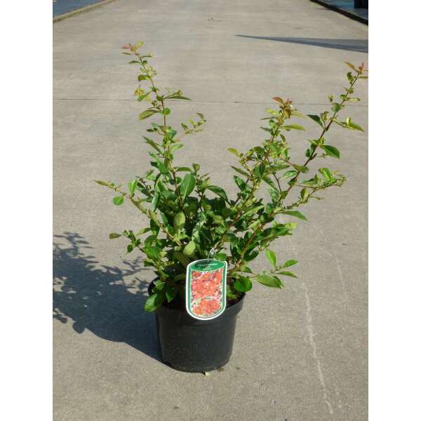 Chaenomeles x superba 'Nicoline' forment un arbuste épineux, très bas et étendu (h150xb150-200cm) avec des feuilles vert foncé brillantes.