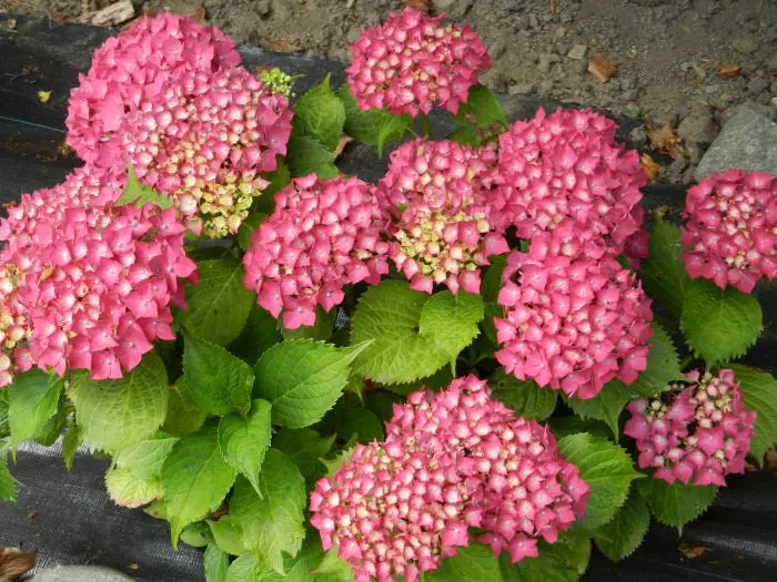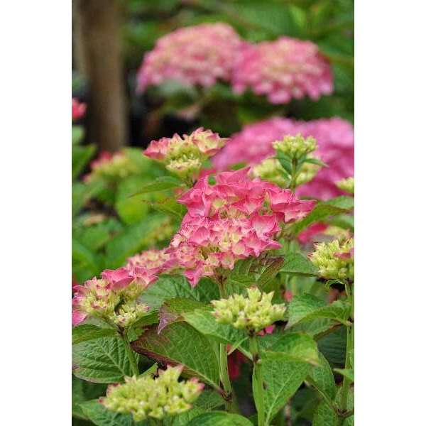 Hydrangea macrophylla 'Glowing Embers' forme un arbuste dense et compact, fleurissant d’un rose rougeâtre vif.