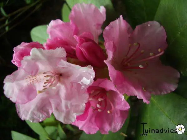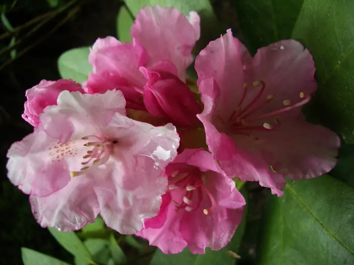 Rhododendron Yakushimanum 'Doc' possède des feuilles lancéolées vert foncé et des fleurs avec différentes nuances de rose.