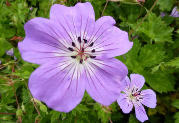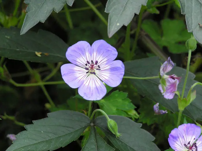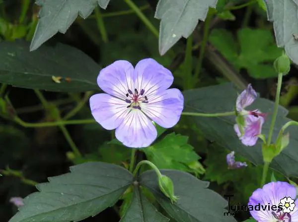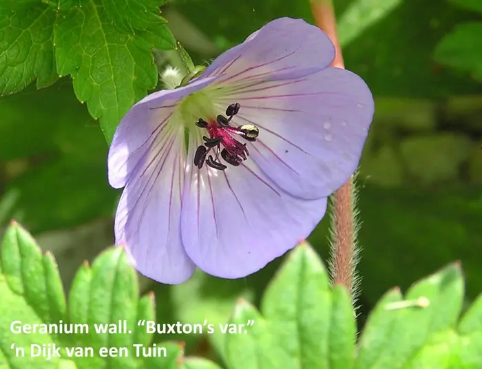 Geranium wallichianum « variété Buxton’s » présente un habit bas et étendu de longues vrilles non enracinées (1 m.) et des feuilles lobulées vert pomme, légèrement tachetées de vert foncé au centre.