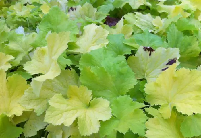 Les feuilles de la Heuchera 'Pistachio' sont jaune-vert.