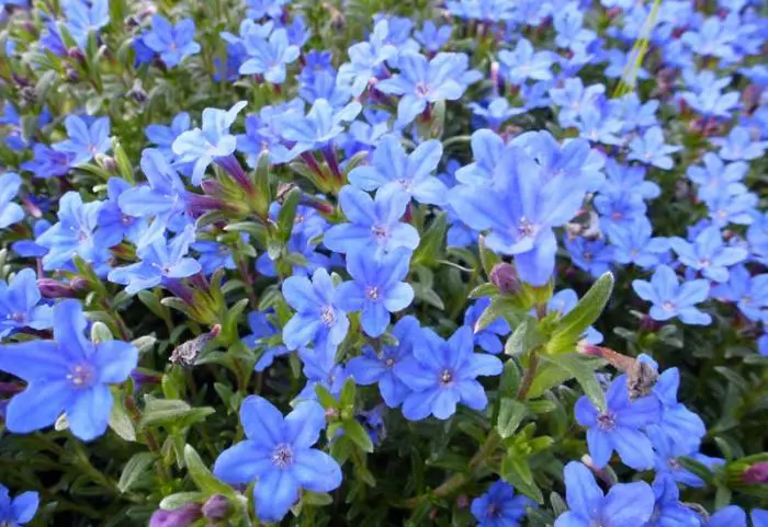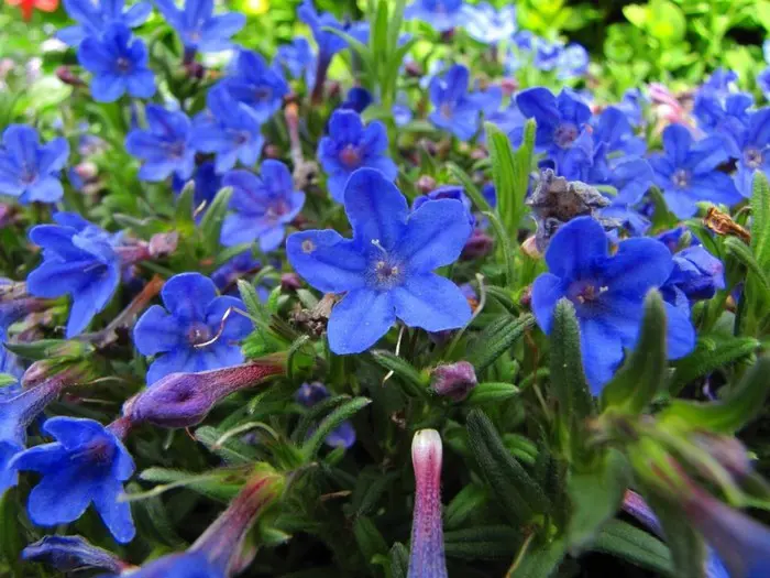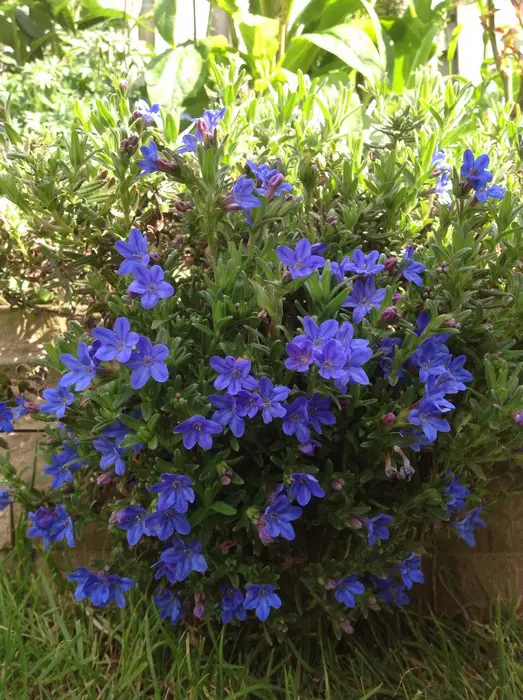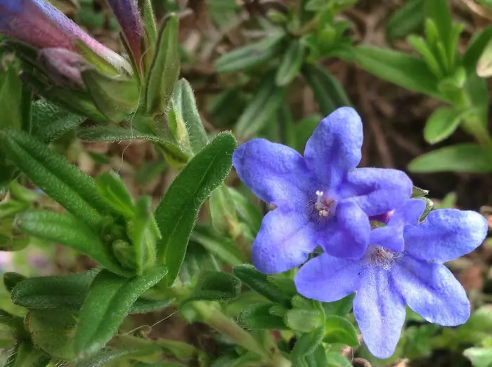 Un semi-arbuste rampant formant du gazon aux fleurs bleu vif, les feuilles sont poilues et persistantes.