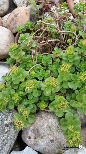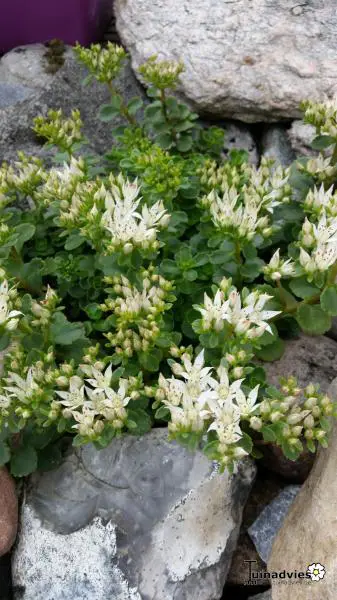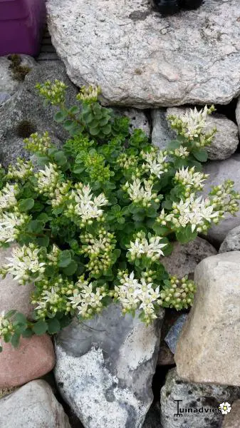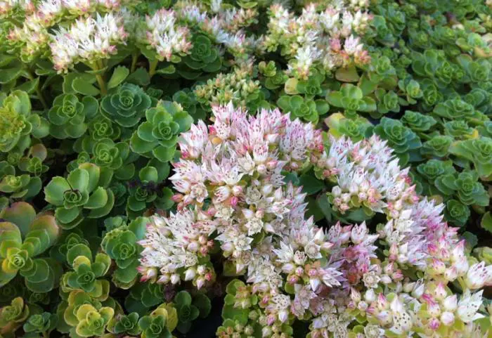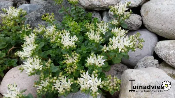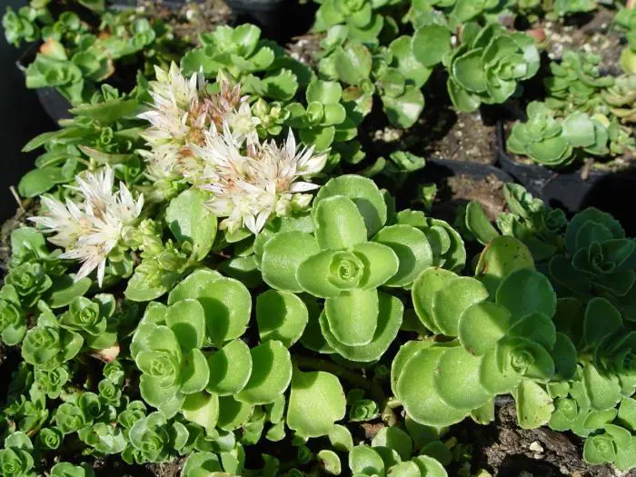 Le sédum spurium 'Album Superbum' fleurit blanc avec de grandes fleurs composées.