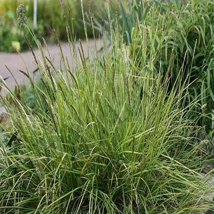 Sesleria argentea forme des touffes denses de feuilles linéaires, vert clair, verdâtres-jaunes au soleil.