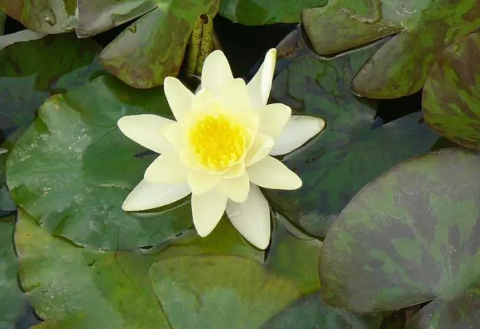 Nymphaea 'Marliacea Chromatella' fleurit avec des fleurs jaunes douces et frappantes de juin à septembre.