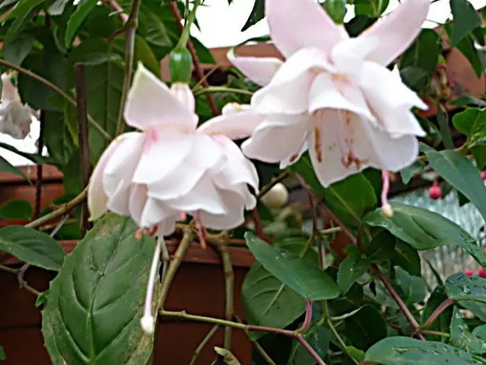 Fuchsia 'White Galore' est un pendentif qui fleurit avec de grandes fleurs doubles en forme de cloche, la couronne est blanche/rouge tachetée de sépales blancs.