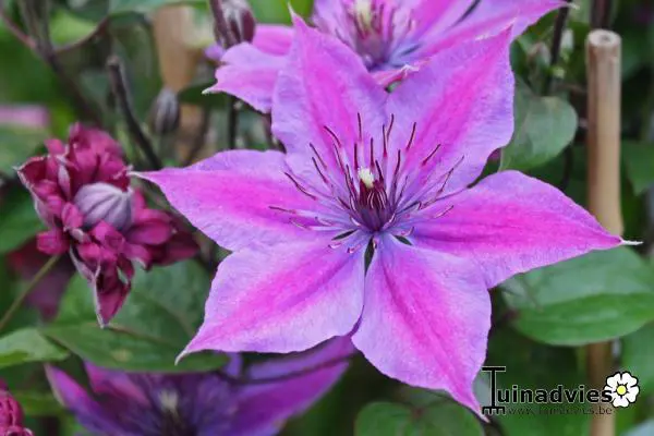 Clematis 'Mon Cherry' (groupe Patens) fleurit d’un rose violet avec une bande plus foncée au centre.