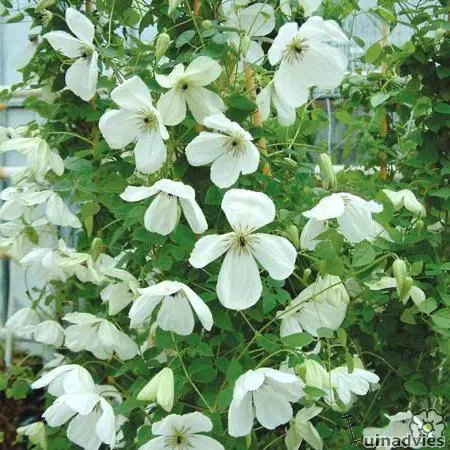 Clematis viticella 'Maria Cornelia' est une clématite blanche (légèrement verte) avec de petites fleurs.