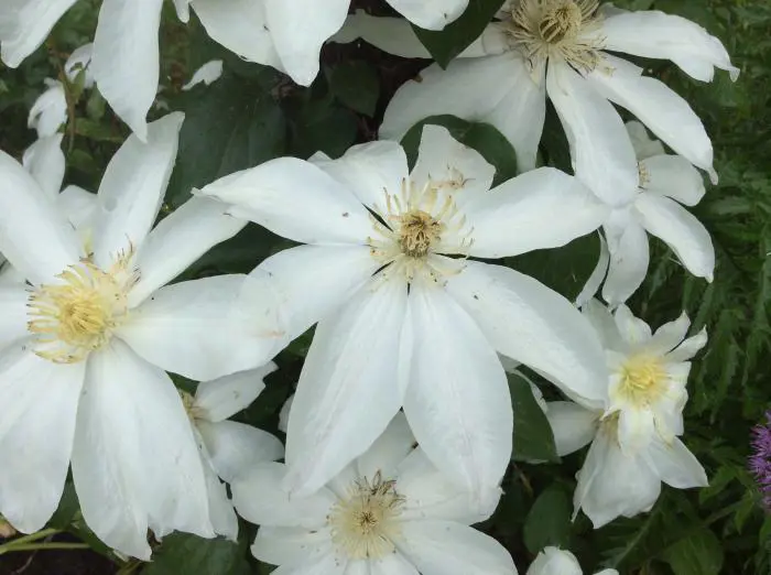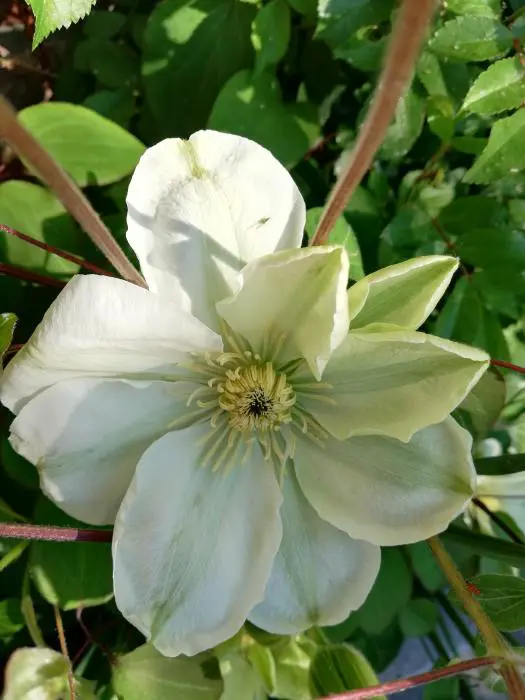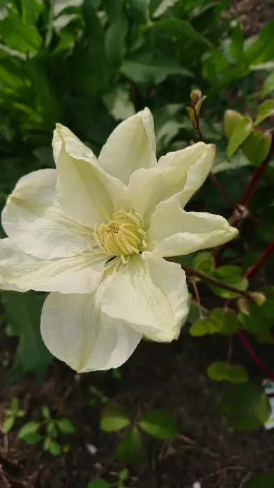 Clematis 'Wada’s Primrule' (groupe paten) fleurit avec de grandes fleurs blanches crémeuses avec des étamines jaune pâle.