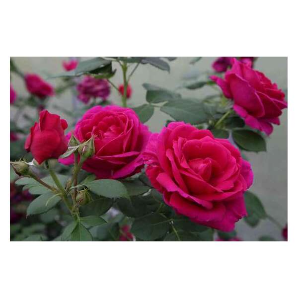 Rosa 'Für Elise est une rose à forte odeur à réfloraison, avec des fleurs de taille moyenne et bien remplies d’un rouge violet.