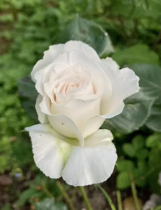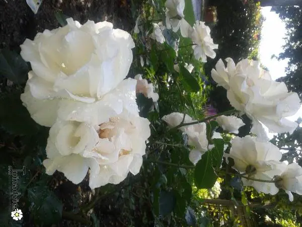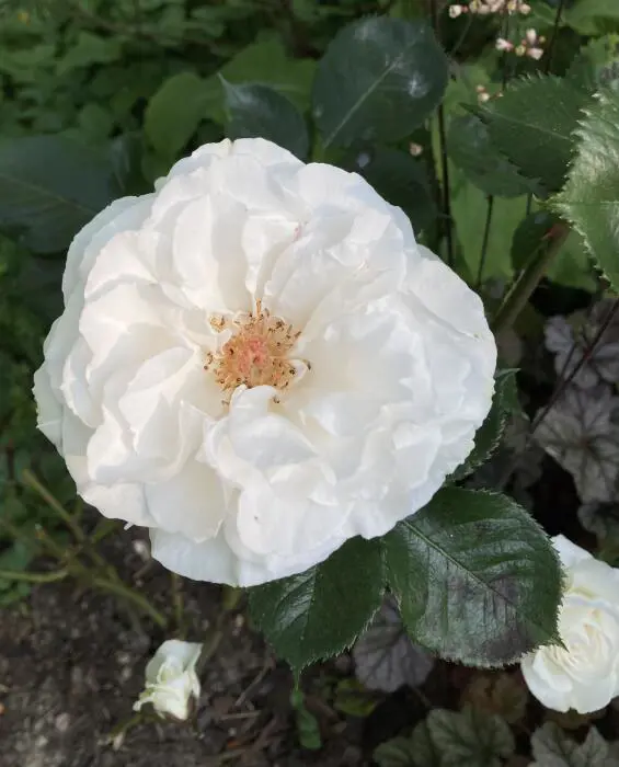 « Margaret Merril » fleurit avec des fleurs blanches semi-doubles teintées de rose au centre.