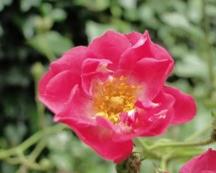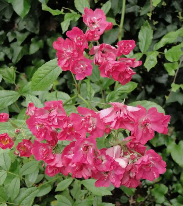 Rosa 'Robin Hood' est une rose légèrement parfumée, bien refleurie, avec des grappes de fleurs simples à semi-doubles rouge cerise.