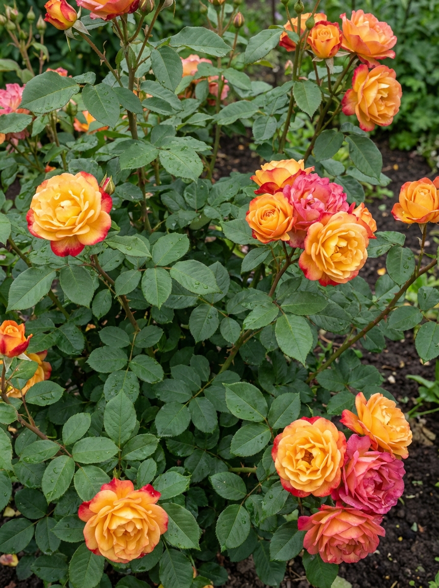 Rosa 'Samba' est une rose en pleine floraison avec des fleurs de taille moyenne et bien remplies. Les pétales sont d’un orange intense avec un dos jaune.