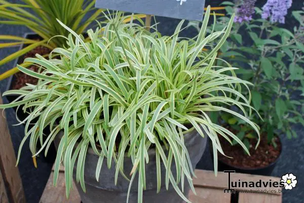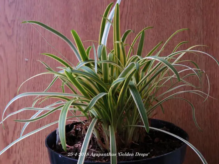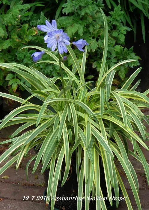 Agapanthus 'Golden Drops' est un cultivar très compact avec des feuilles fines et panachées qui surplombent, vert clair avec des bords jaune crème.