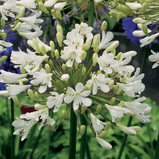 Agapanthus 'White Umbrella' a des feuilles en forme de ceinture et fleurit abondamment avec de grandes ombelles rondes de fleurs blanches en forme de trompette sur des tiges vertes robustes.