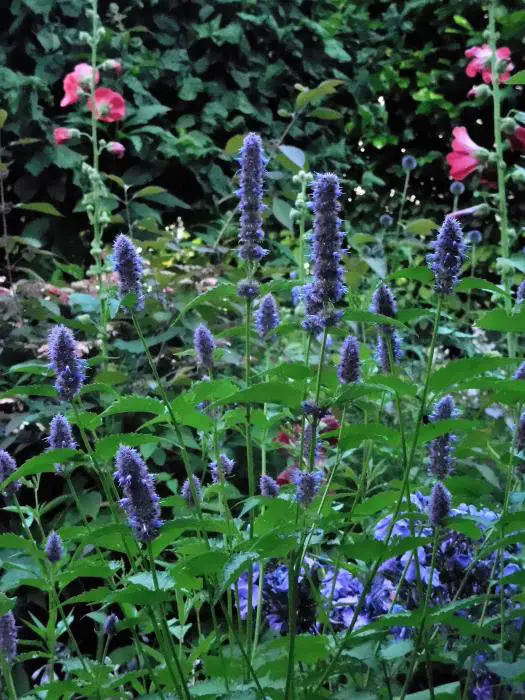 L’agastache féénicule a des feuilles doucement poilues et sent l’anis, les bractées violettes apportent de la couleur longtemps après la floraison violet-bleu.