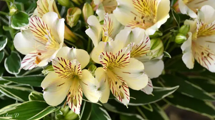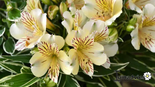 Alstroemeria 'PRINCESS Fabiana' fleurit avec des fleurs jaune crème clair avec une tache jaune douce au centre et des taches violettes/fines rayures.