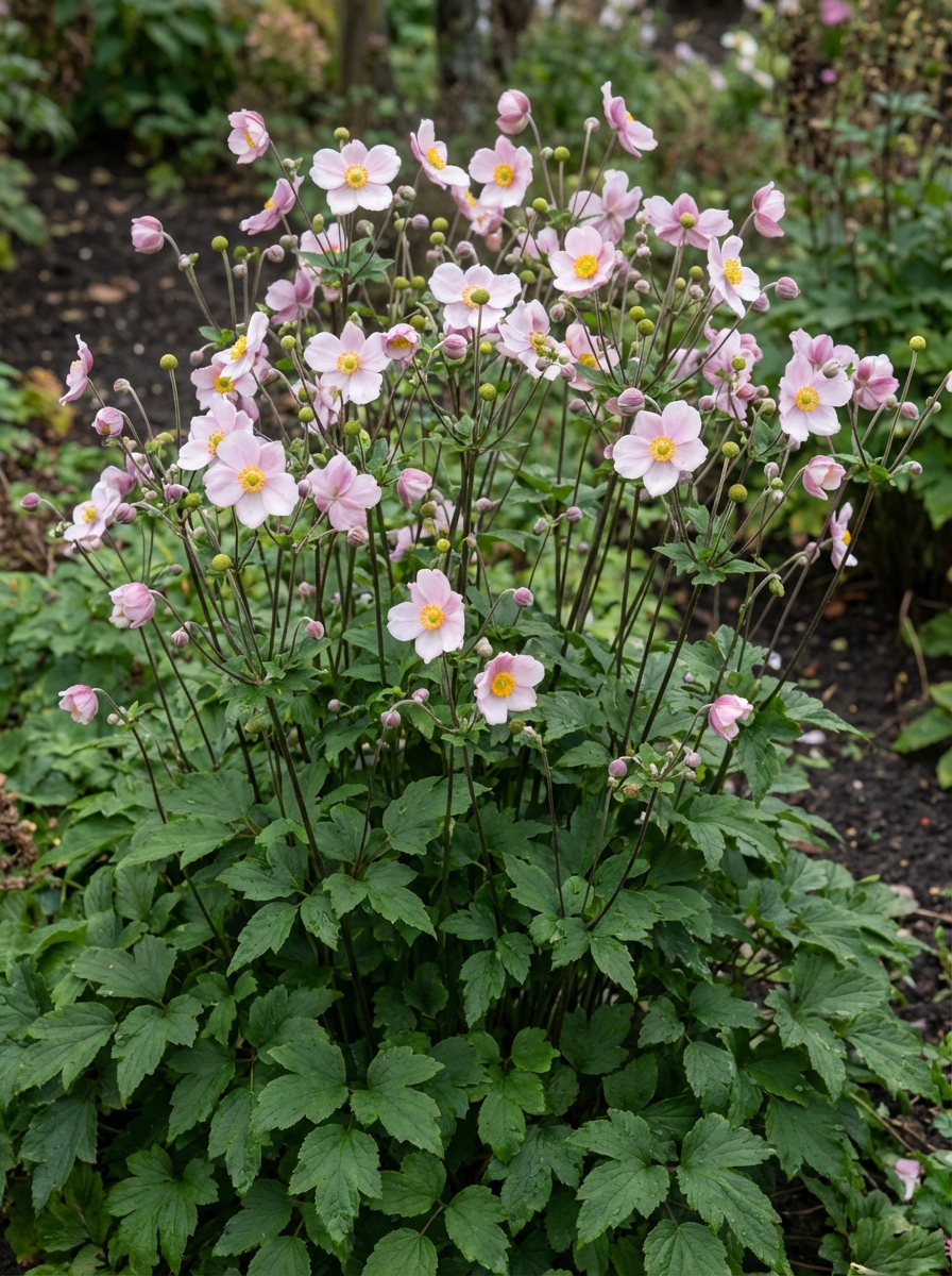 Anémone x hybrida 'Ouvertüre' fleurit avec des fleurs simples de rose lilas avec des étamines jaune doré, sur des tiges hautes et robustes.