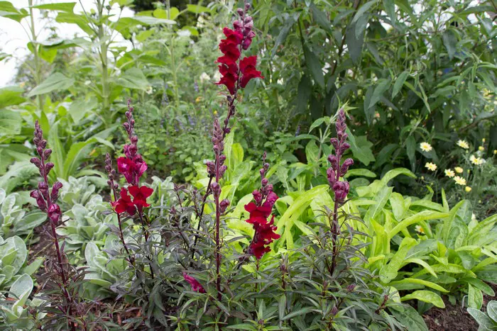 Antirrhinum majus 'Prince Noir' a des feuilles vert violet foncé fleurissant de fleurs veloutées rouge sang.