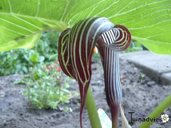 La fleur fleurit avec une gaine florale rayée blanche/acajou avec une longue ficelle en forme de spadix et un spadix vert.